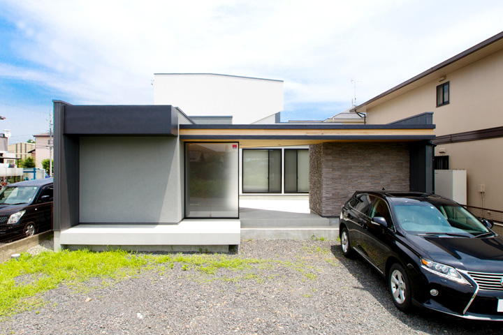 住宅の顔である玄関正面には外観デザインのアクセントとなる大型のすりガラスを配置し、住まう人のプライバシーも考慮。また、外壁に一部デザインされた石貼りの壁、実は内部は使い勝手の良い外部収納となっております。また自転車を置くスペースも外部からは見えにくい位置に確保するなど、日常生活に欠かせない部分も細かく配慮した設計となっております。