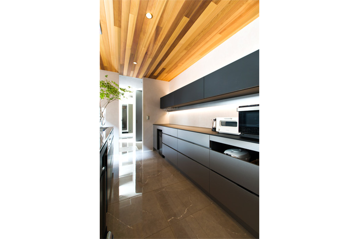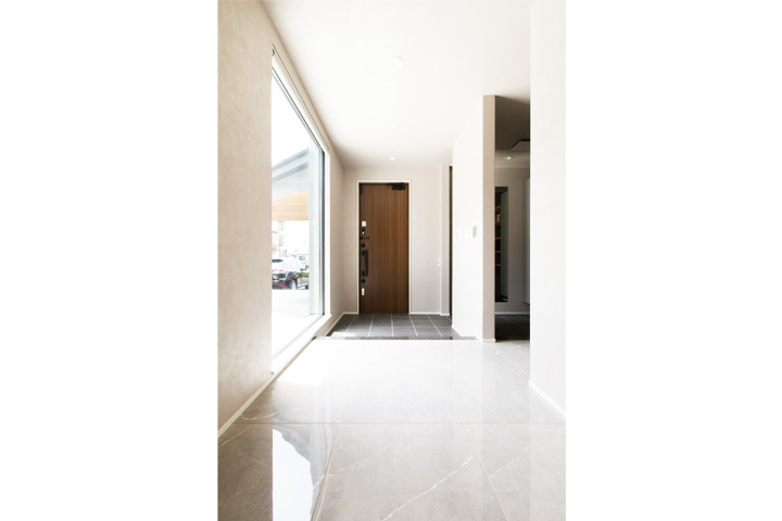 玄関ホールからキッチンにかけて、床はシックなグレーの大判タイル貼り仕様とし、ドアを開けた瞬間から海外のホテルのようなセンスの良い空間です。使い勝手の良いシューズクロークと奥様こだわりのパントリーも配置されております。