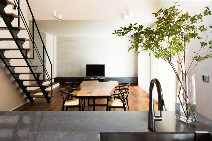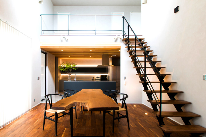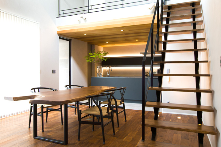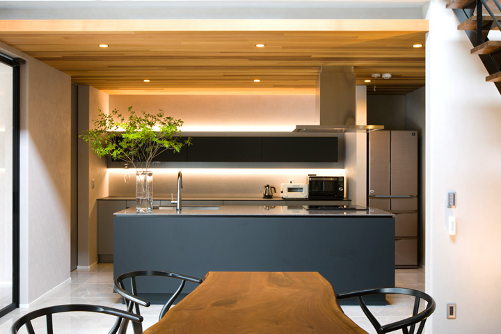 キッチンはワインセラーを装備したり、間接照明を配置したりなどワンランク上のアイランドスタイルのフルオーダーキッチンです。モノトーンでありながら木目の天井がバランスよく落ち着いた空間に。キッチンとつながったダイニングは設計担当と一緒に選んだ一枚板のダイニングテーブルが主役となっており、ご家族の会話もはずみ思わず長居したくなる居心地のよい場所になるのではないでしょうか。