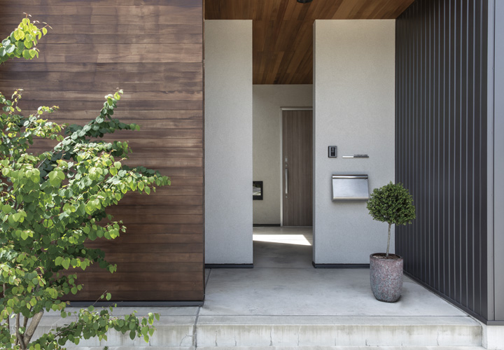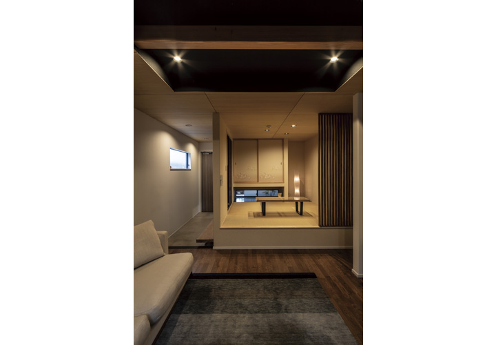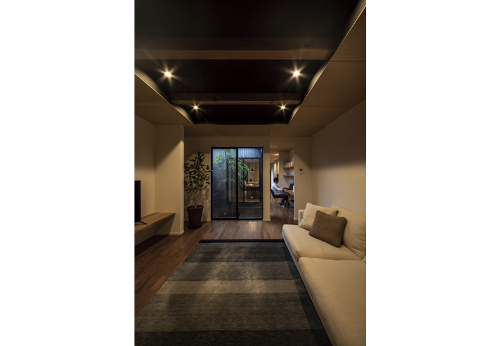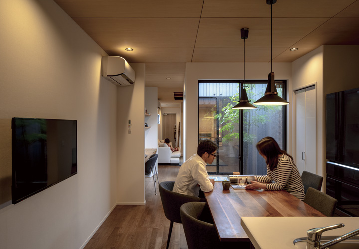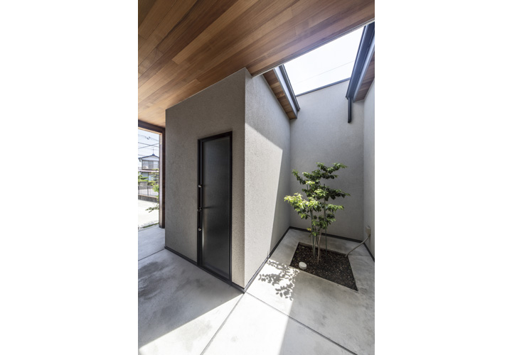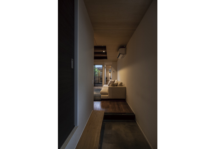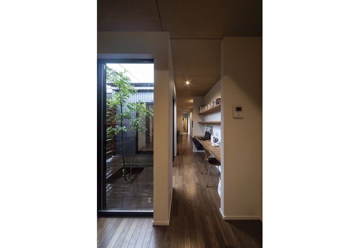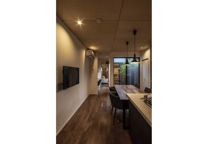 works 長~い平屋 HOUSING 間口5.6m×奥行52mの細長い敷地に合わせて設計・プランニングした和モダンがコンセプトの平屋住宅。 玄関の式台とリビングの造作テレビボードは施主様こだわりのノタ付きの無垢一枚板を使用し、玄関からキッチンの天井はシナベニヤ板を張る等、随所に和のエッジが効いています。 リビングとキッチンを繋ぐ廊下はパソコンや勉強スペースに。光と風が心地よいので、勉強もはかどることでしょう。 プライバシーを保ちながらも室内を通り抜ける風が心地よい、町屋のような平屋住宅です。