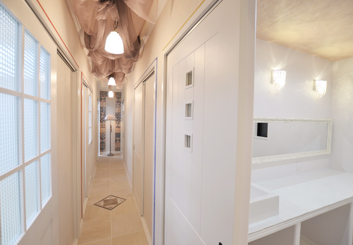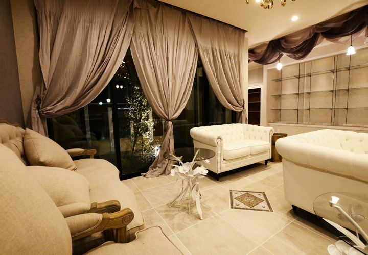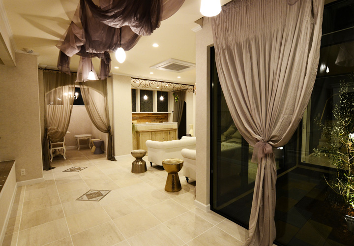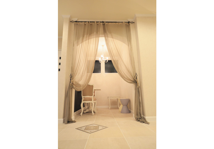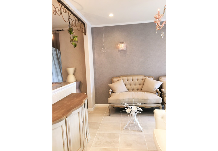 works Prima Pulito(エステサロン) SHOP エステサロンの店舗兼社屋。エステサロンはクラシックかつ女性らしい上品さもプラスした落ち着いたテイストで統一。 サロン待合室の家具はサラグレースをチョイス。フレンチシャビーなソファーや受付カウンターや下足入れが特別感のある空間を演出してくれます。 床や壁のタイルや照明一つ一つの細かい素材も徹底して選びました。
