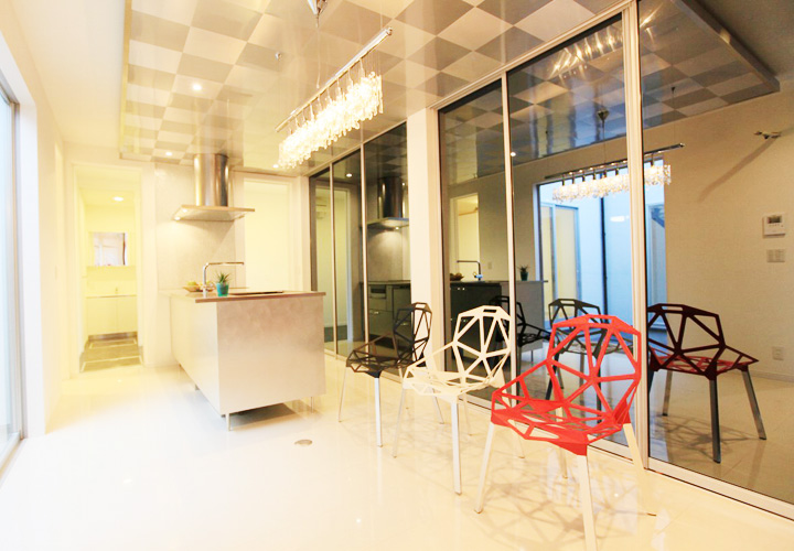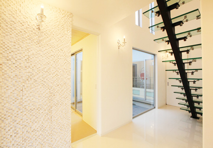 インテリアが光るモダン住宅 インテリアが光るモダン住宅 外壁に凹凸のある石やタイルを使用し、カフェやインテリアショップを思わせるデザインの外観。 白を基調とした内装は、美術館のホールにいるような気分になります。 階段やキッチンの天井材、照明器具など、輸入材を随所に使用することで、洗練された非日常空間を演出しています。 施主様のご要望をふんだんに取り入れたデザイナーズ家具が似合うお宅が完成しました。