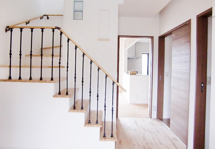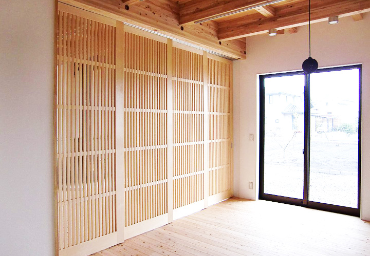薪ストーブのある自然素材の家 薪ストーブのある自然素材の家 素材と設備にこだわった物件です。アウトドアがお好きなご主人も満足の、玄関から繋がる広々収納スペース。 室内は漆喰壁。フローリングは節目が美しい桜の木。天井は梁と木目を活かして落ち着いた和の雰囲気づくりをしました。 リビングとダイニングを仕切る格子扉は特注品です。深い軒があるので夏は涼しく、冬は薪ストーブのおかげで半袖で過ごせる快適なお家です。太陽光発電パネル搭載。