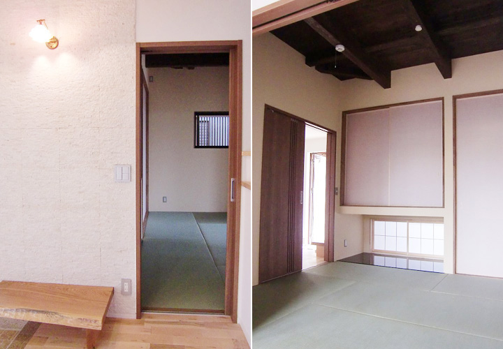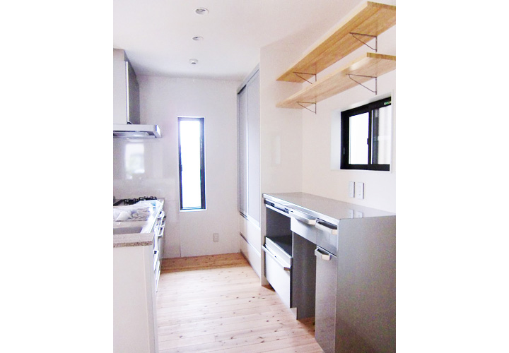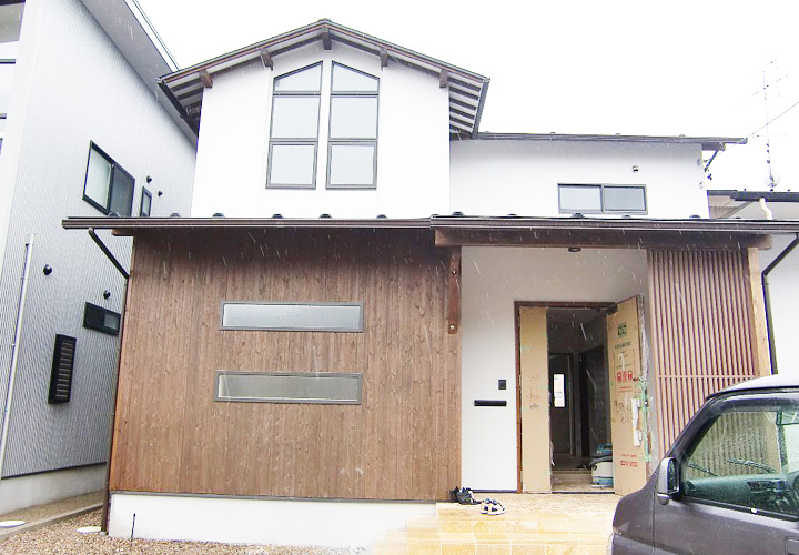 works 薪ストーブのある自然素材の家 薪ストーブのある自然素材の家 素材と設備にこだわった物件です。アウトドアがお好きなご主人も満足の、玄関から繋がる広々収納スペース。 室内は漆喰壁。フローリングは節目が美しい桜の木。天井は梁と木目を活かして落ち着いた和の雰囲気づくりをしました。 リビングとダイニングを仕切る格子扉は特注品です。深い軒があるので夏は涼しく、冬は薪ストーブのおかげで半袖で過ごせる快適なお家です。太陽光発電パネル搭載。