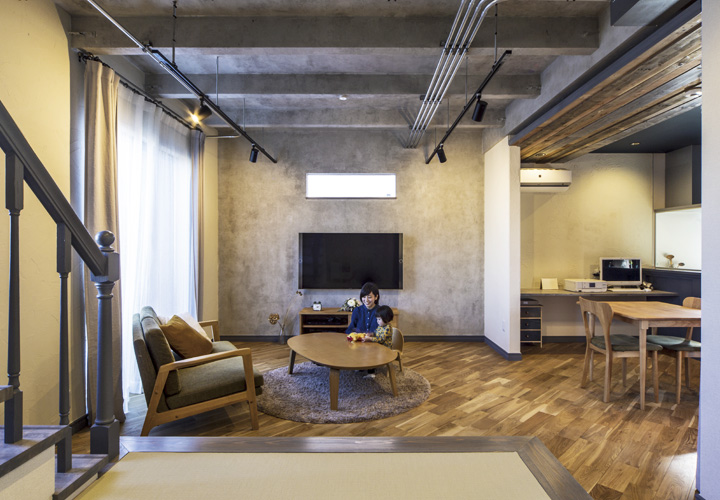 「流行りだけでなく本物のカッコよさを追求したら本当に手間が掛かりました、でもお客様が喜んで下さったことが何よりも嬉しい」と担当した山田。 室内ドアやキッチンカウンターは入念に選んだカラーで丁寧に塗装。リビングの壁と天井も自らの手でコンクリート風に加工し、お客様がこだわった 剥き出し配管との相性も抜群です。玄関ポーチ壁のモルタル塗装は思わず手を触れたくなるカッコよさ。 古材やタイルも随所に使い、ハード過ぎないインダストリアルスタイルに仕上がりました。