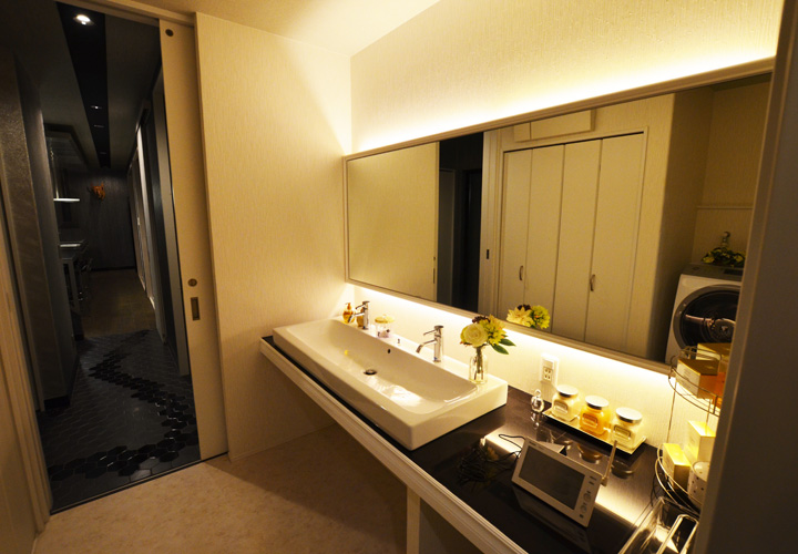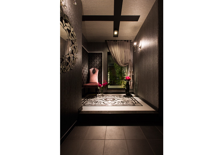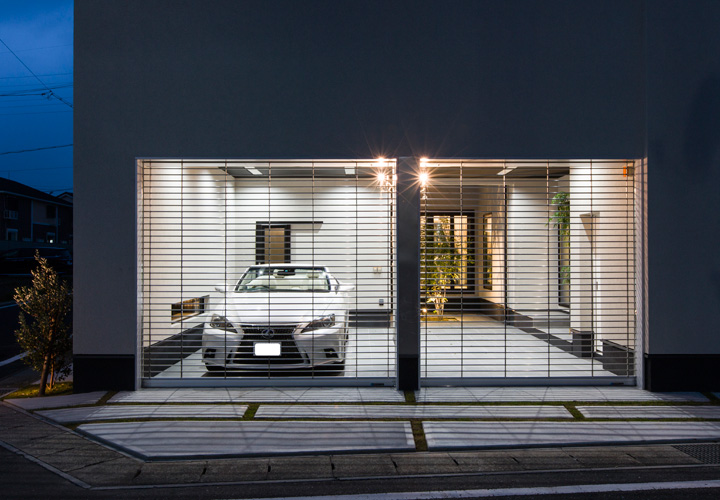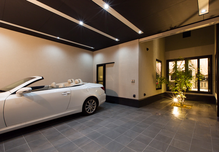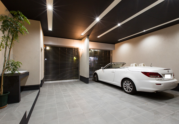 「ホテルみたいな家がいいな」の施主様のひとことから始まった家づくり。コンセプトは非日常でありながらもリラックスして過ごせるワンランク上の住宅です。 ダイニングキッチン、寝室、洗面は間接照明による優しい空間演出を。一日の疲れを癒す浴室にはライトアップされた景色を眺められる大きな窓をつけました。 主寝室から繋がる広々ウォークインクローゼットやパウダールームには奥様も大満足です。 鋳物門扉や玄関ホールの床タイル、シャンデリアなど海外から直輸入した素材を使い、インデザインでしかできないデザインを実現しました。 車2台がゆったり停められるガレージ内にはお散歩から帰った愛犬の為のシャワースペースも設置。家族を大切にする施主様らしさが沢山詰まっています。