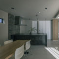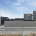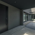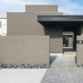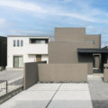 グレージュの塗り壁とグレーのガルバを合わせ一部石張りで重厚感を出した落ち着いた外観。プライベート性を重視し、窓がない正面のデザインは一見閉鎖的に見えますが、内側に入ると空間が広がり、中庭を囲うようにコの字型の間取りで設計されております。