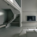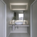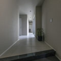 玄関からリビングに続く廊下には中庭が眺められるよう計算された大きな窓が印象的です。窓から見える中庭のシンボルツリーはいつの日か更に成⾧した姿が期待できます。また廊下の途中には洗面化粧台が置かれ、機能的だけでなく上下に間接照明を施すなど、デザインにもこだわった洗練されたスペースです。