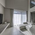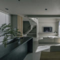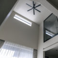 リビングドアを開けるとダイニングキッチンからリビングへ抜けるようなダイナミックな空間が広がります。キッチンは男性的な重厚なイメージの反面、内装は柔らかく女性的な仕上がりに。リブ材の壁やダイニングテーブルに板目の美しい木を取り入れるなどお施主様と吟味しセレクトした素材も合わさり、見事に調和がとれた空間となりました。ダイニングを通り抜け、美しいモールテックスの階段、お施主様が選ばれたローデザインのソファなど、空間にそれぞれがマッチし、室内用の大窓を設けた吹き抜け空間は、室内全体に柔らかな光が差し込むよう計算されており、まるで海外の雑誌の1 ページを切り抜いたような大空間のリビングルームは圧巻です。奥様こだわりの造作したパウダーコーナーはリビング側からは隠れた秘密の空間。スタディコーナーとしても兼用でき非常に機能的です。設計士の計算の妙技とお施主様のこだわりが合わさり、海外住宅を思わせる美しい空間を持つ邸宅となりました。