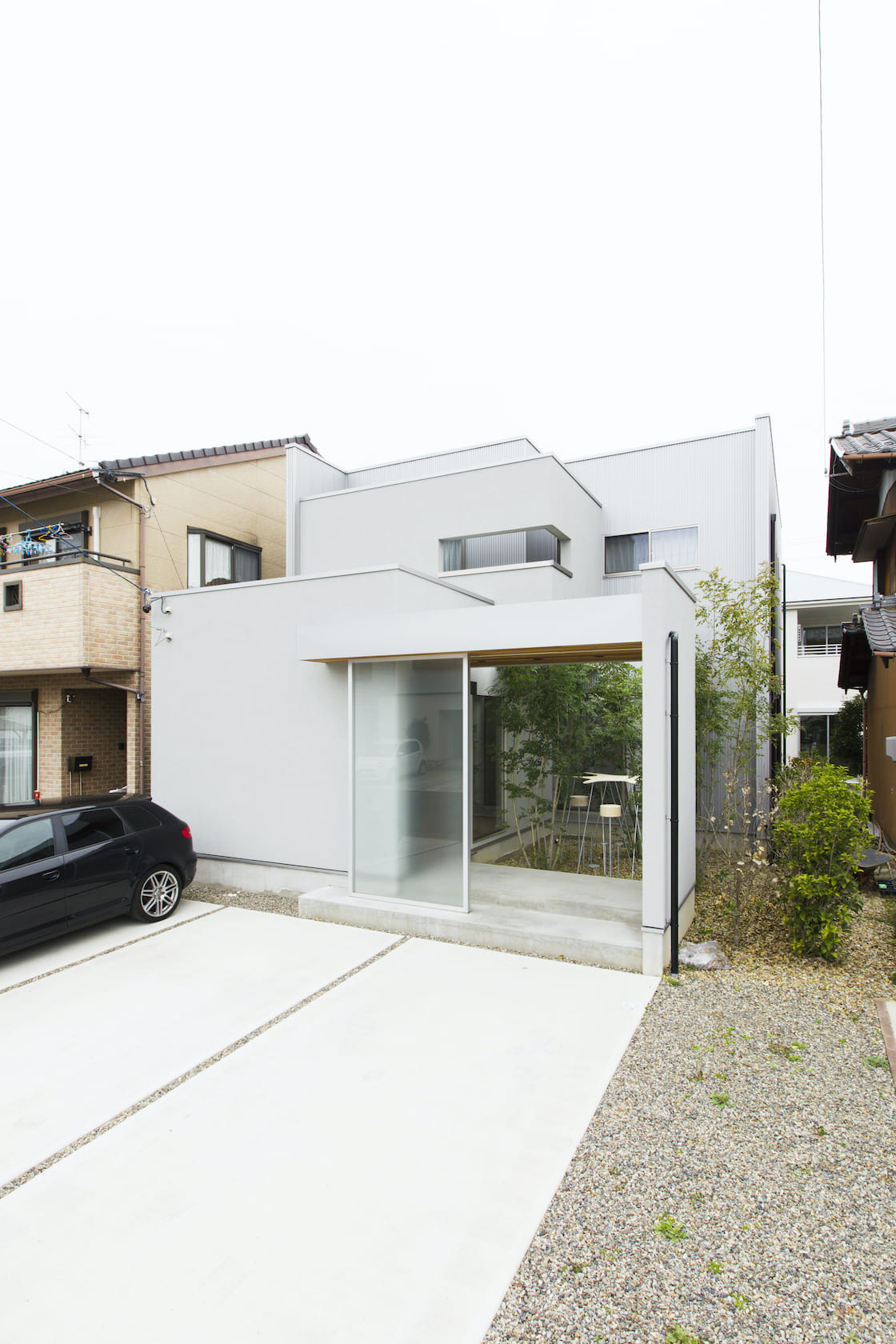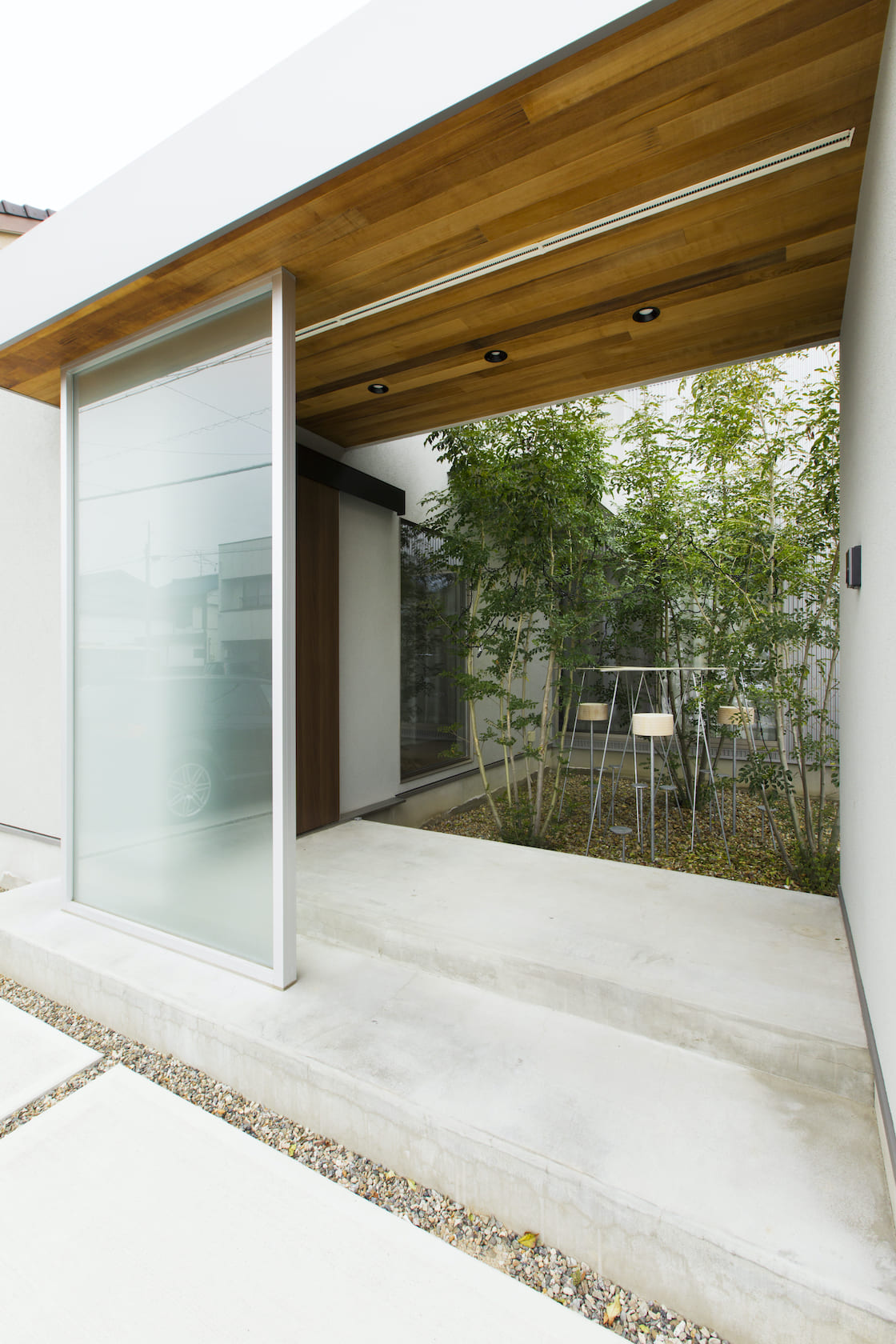 スクエアなデザインが目を引く外観。天気の良い日には空のブルーに映える真っ白な塗り壁とガルバリウムで構成された一見モダンでシンプルな建物の印象ですが、一歩立ち入ると木質の天井と庭先の木々 達が優しい雰囲気を与えてくれます。