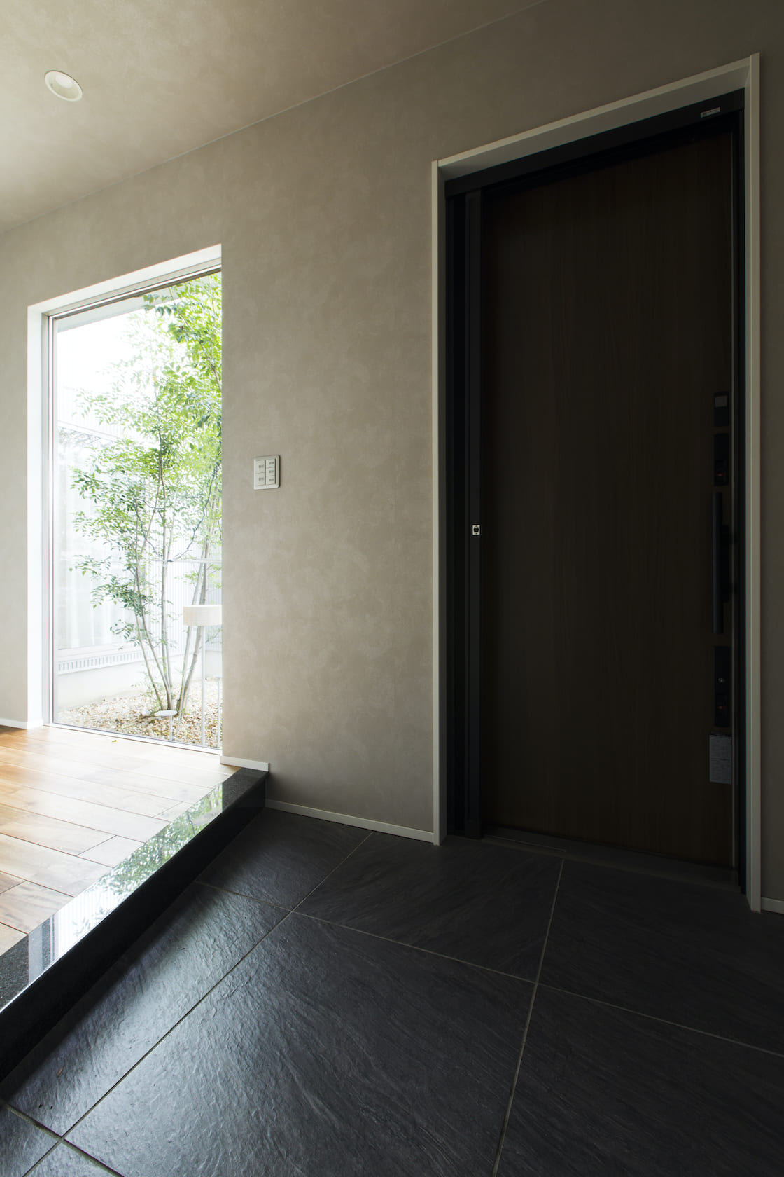 玄関ホールは玄関ドア、床のタイルなどシックな色でまとめており、大きくとったFIXの窓から見える中庭の植栽は一枚の絵のようなアートな空間。