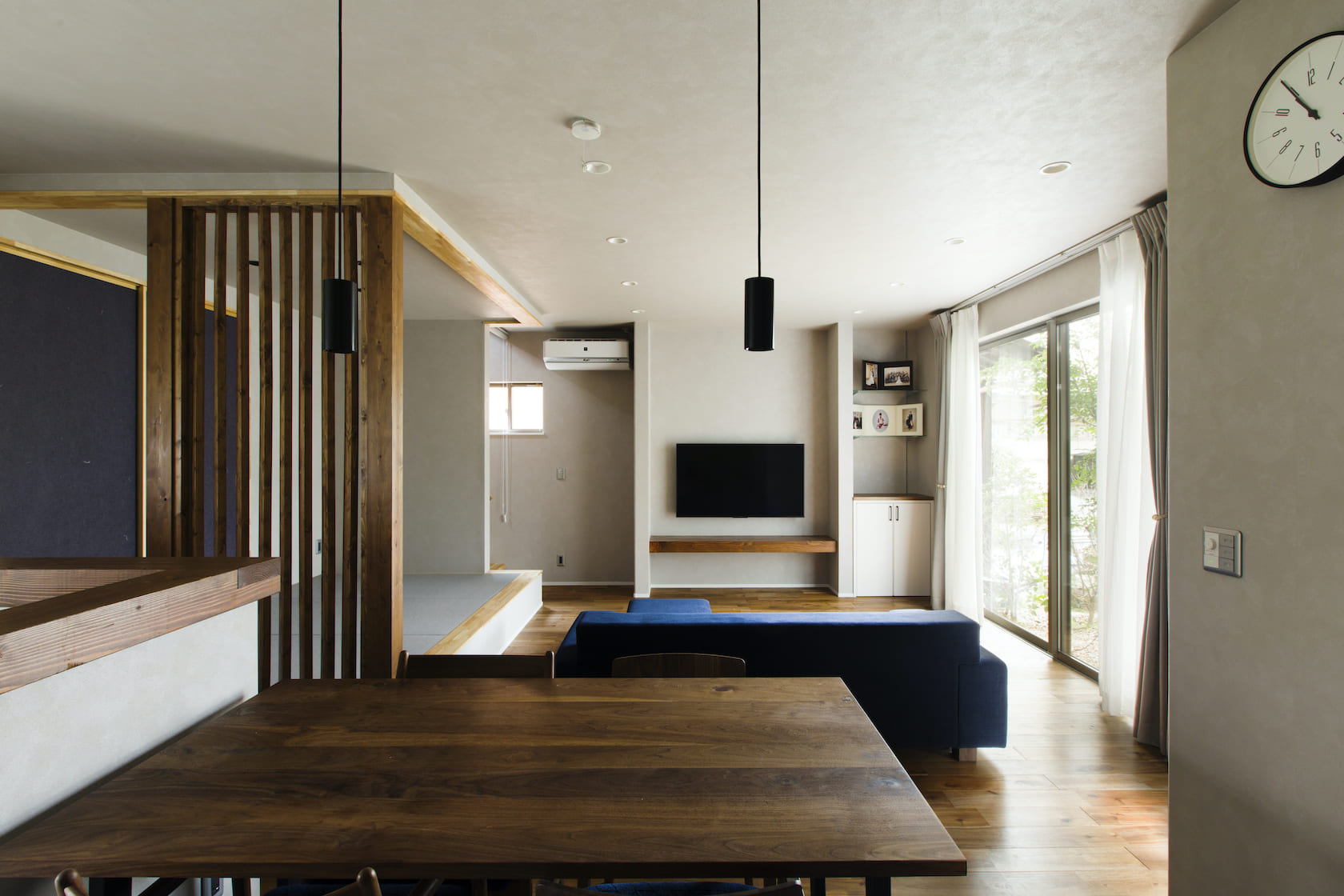 内装は落ち着いたトーンでモダンにまとめられており、リビングに隣接した小上がりの畳コーナーがほっと一息つける和みのスペースであり、色々な用途で活用いただけると思います。無垢材の床と小上が りの畳コーナーの一角に配置した木の格子ルーバーが室内のアクセントと温かみをプラスしております。 キッチンからリビング全体を見渡す事ができ、家事をしながらもご家族の時間を大切にしていただける、そんな間取りになっております。キッチンバックには大型の収納を備え、来客の際は扉で隠せる嬉しい造りです。