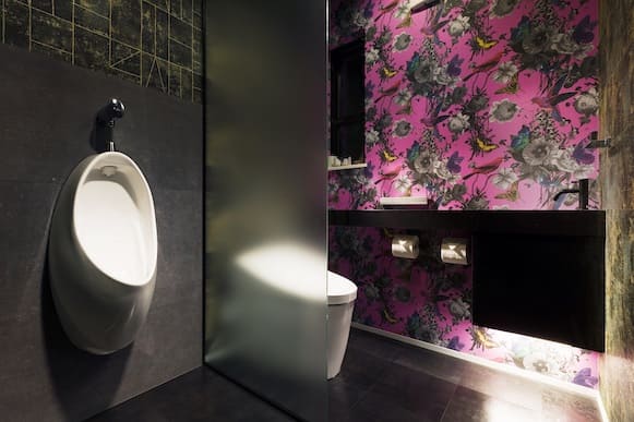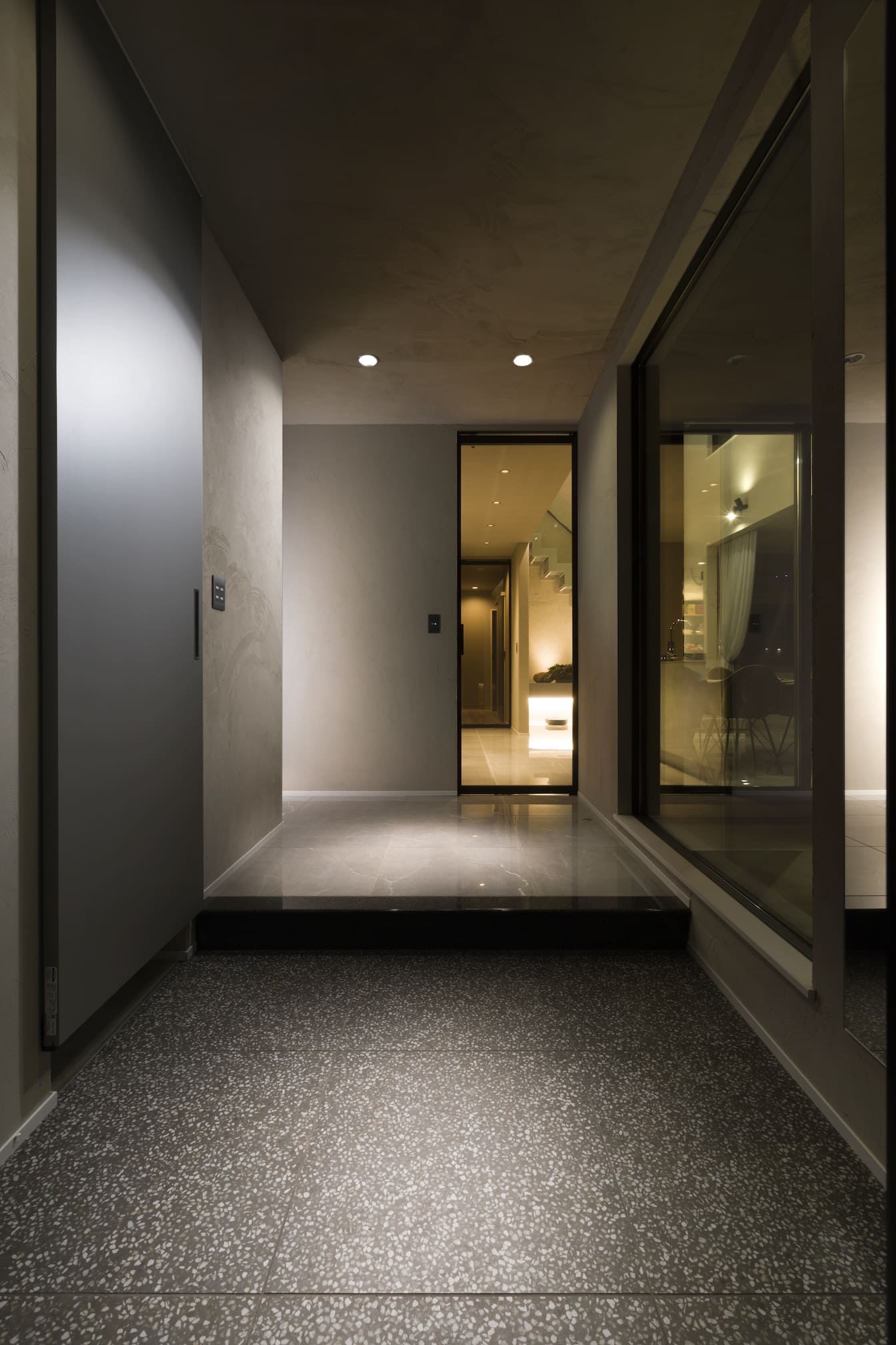玄関ホールからLDKへと続く床タイル、ガラスとモールテックスを取り入れたオーダーメイドの階段、LDKの入口に配置したシルエットが美しいガラスドアなど、とことん素材やディティールにこだわりました。その室内はヨーロッパの高級ホテルを思わせる独創的かつ美しい造りとなっております。