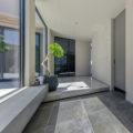 中庭が見渡せる、塗り壁とタイル張りが優雅で落ち着いた玄関。リビングへと続くガラス扉を開けると、柔らかな色彩でまとめられたリビングとダイニングへと続きます。