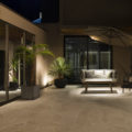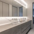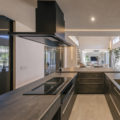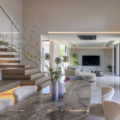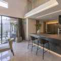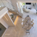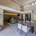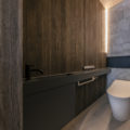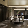 LDK には上品な輝きを放つ大判の床タイルやリビングの壁にはウェーブ形状が美しいレリーフタイルを採用。階段のモールテックスやキッチンのカラーなど、数々の素材は施主様のセンスで選定され、海外リゾートのスイートルームを思わせるような洗練された唯一無二の空間となりました。素材や形すべてにこだわった家具たちも施主様が厳選された一品ばかり。夜は、昼間とは異なりドラマティックな表情を見せ、非日常的な時間をお過ごしいただけるはずです。