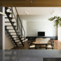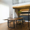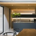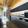キッチンはワインセラーを装備したり、間接照明を配置したりなどワンランク上のアイランドスタイルのフルオーダーキッチンです。モノトーンでありながら木目の天井がバランスよく落ち着いた空間に。 キッチンとつながったダイニングは設計担当と一緒に選んだ一枚板のダイニングテーブルが主役となっており、ご家族の会話もはずみ思わず長居したくなる居心地のよい場所になるのではないでしょうか。